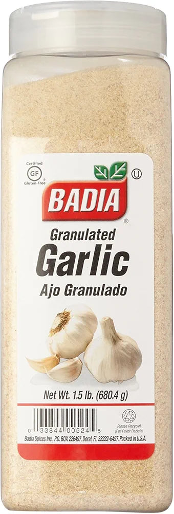 Enhance your dishes with the versatile Badia Granulated Garlic seasoning. Packed with intense flavor, this convenient 680.4g packaging is a must-have for every kitchen.