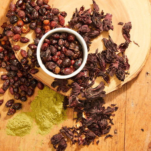 Hibiscus is combined here with rosehip, also rich in vitamin C and widely used as a beverage that brings a degree of relief to joint pain, and in the best case scenario it can prevent any worsening of muscle problems. In addition rosehip has a mildly sweet, sharp taste that fuses very effectively with the hibiscus without being overwhelming.