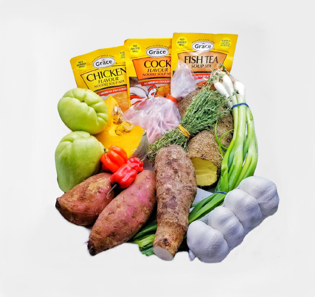 Soup Box includes the following fresh produce :-<br /><br />Yellow Yam (400g)<br />1 Jamaican Sweet Potato<br />3 Scotch Bonnet Peppers<br />1 Garlic Pack<br />1 Coco Yam<br />1 Fresh Thyme Bundle<br />1 Spring Onion Bundle<br />1 Chow Chow <br />1 Pumpkin Slice<br />1 Puregro Coarse Cornmeal (500g)<br />1 Pack of Grace Chicken Noodle, Fish Tea or Cock Soup (selection required)<br /><br />** Meat Sold Separately **
